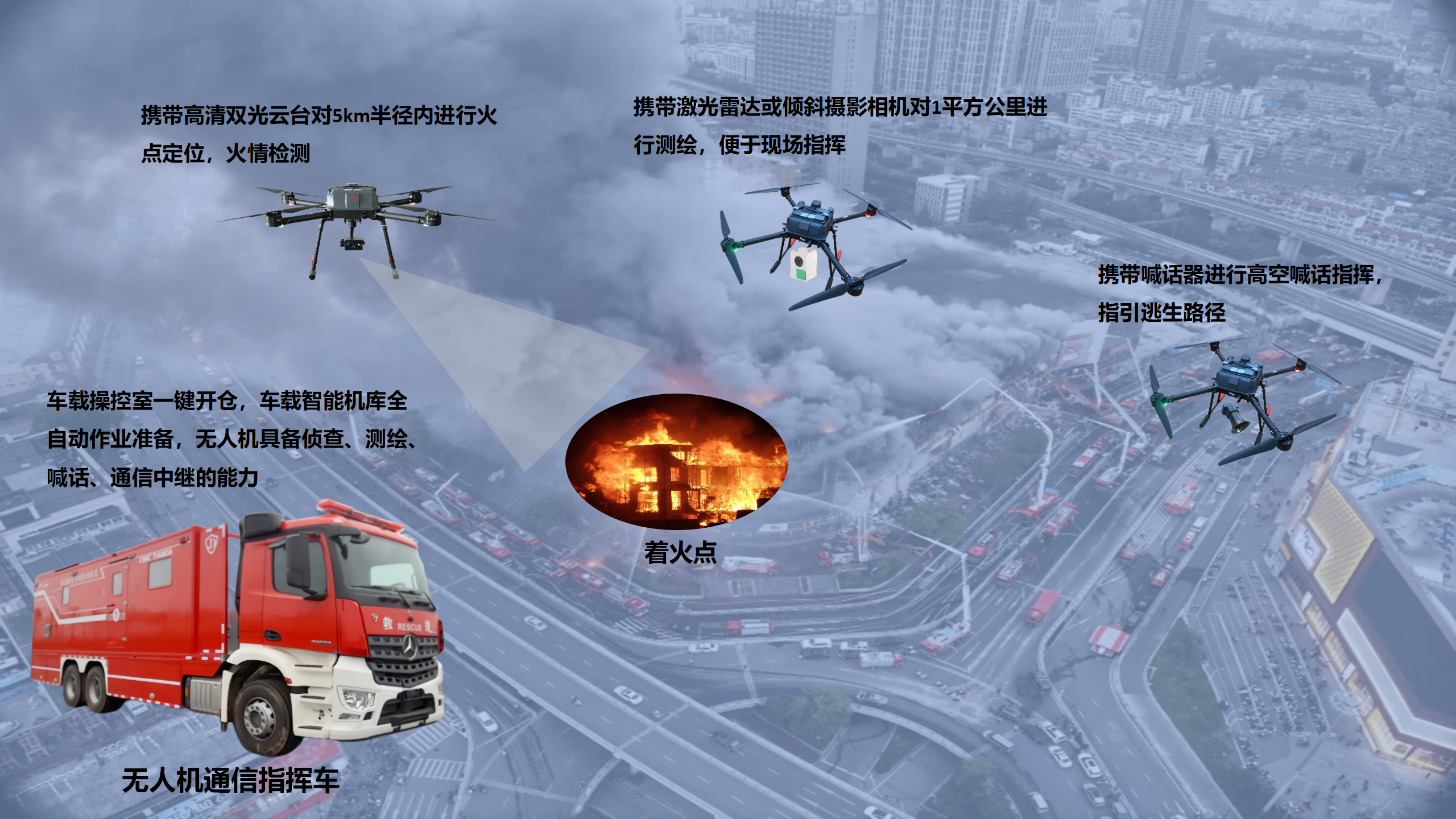 城市火灾现场往往复杂多变,无人机通信指挥为城市消防救援提供了 “空地一体、快速响应、精准指挥” 的新型作业模式,有效解决了传统消防在复杂城市环境中面临的信息滞后、视野受限、指挥效率不足等痛点。