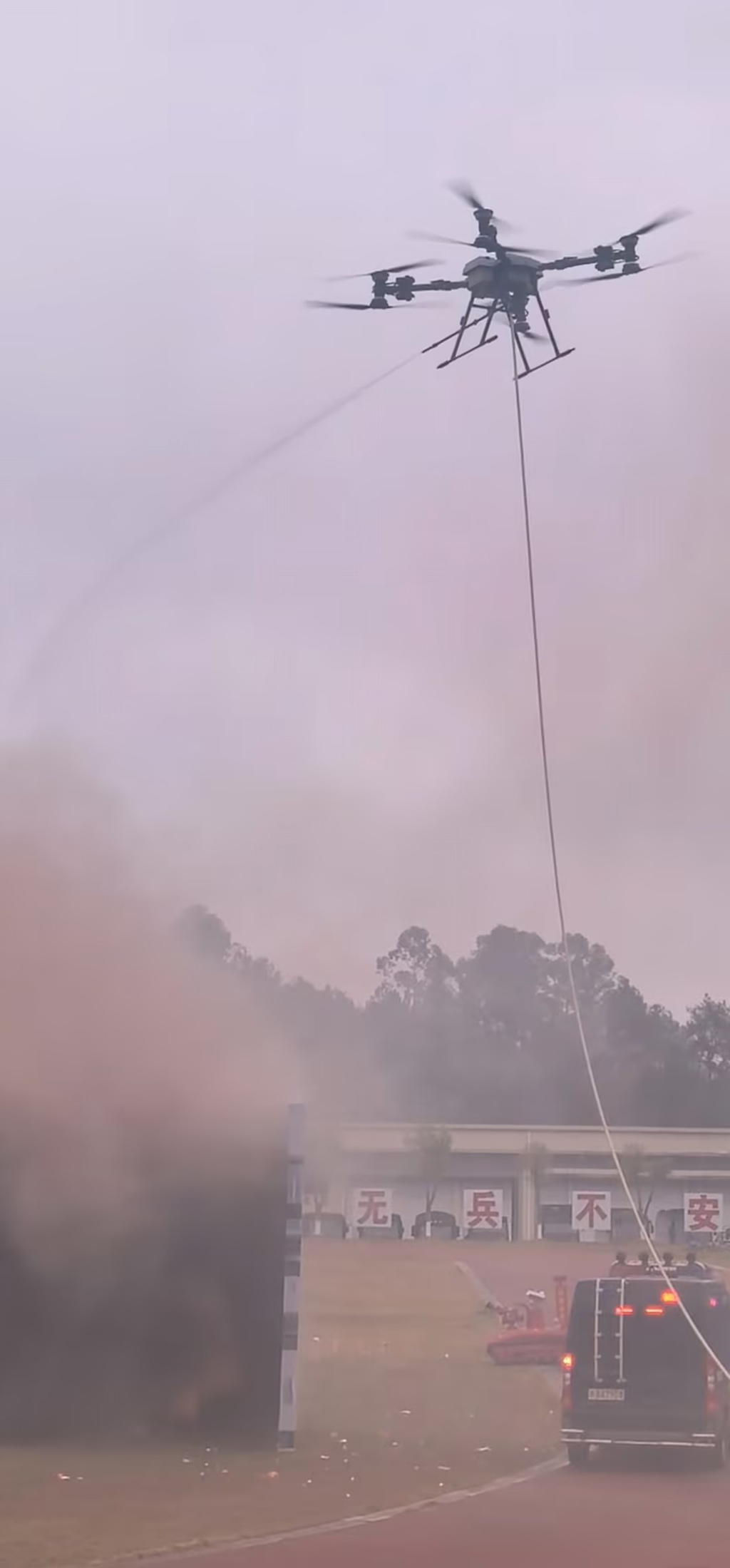 作为重载消防无人机中的佼佼者,这架100KG级灭火装备展现出极强的实战优势。其核心亮点在于搭载了专用灭火水枪,可直接实施高空以水灭火作业;同时配备的自组网系统,确保了在复杂环境下的通信畅通,配合地面自组网通信设备,即便在爆炸产生的信号干扰中,仍能与地面指挥所、消防队伍实现精准联动。在空中盘旋定位后,无人机携灭火水枪精准对准着火点,自上而下喷射高压水流,与地面灭火力量形成“空对地”协同作战格局,稳稳压制火势蔓延,最终成功完成灭火任务。整个过程行云流水,不仅高效处置了模拟灾情,更充分验证了搭载灭火水枪的大载重无人机在高空灭火及重要目标应急救援中的关键作用。