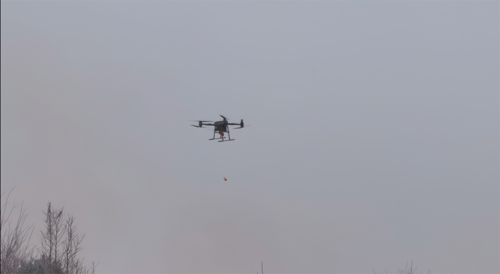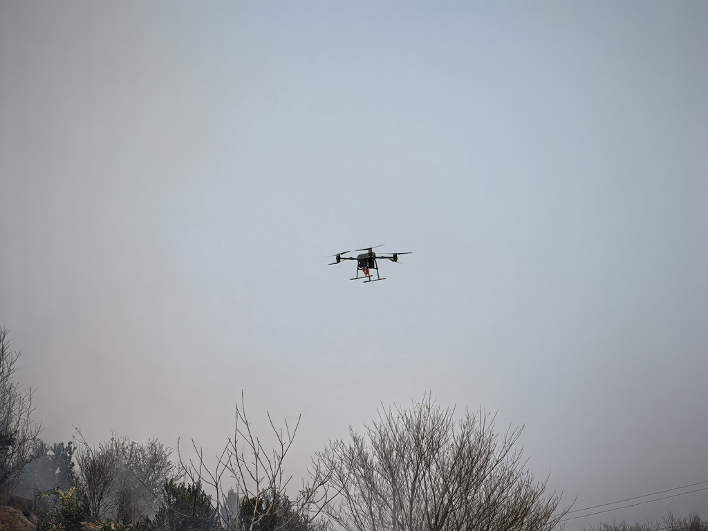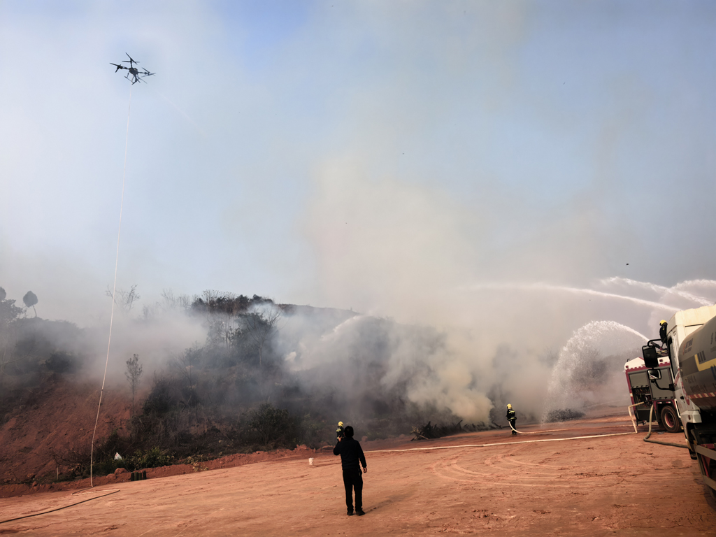 在灭火攻坚环节,慧明捷巨灵系列无人机轮番上阵,展现出强大的精准处置能力。其中,巨灵-50无人机携带抛投器并挂载4枚灭火弹,精准飞抵火点上空后,按指令完成灭火弹抛投,灭火剂迅速扩散覆盖火点,有效压制火势蔓延;巨灵-150无人机则携带高压水枪,针对残余火点实施精准喷水作业,形成“投弹压制+喷水肃清”的立体灭火模式,快速实现火情扑灭。整个过程中,无人机协同作战、衔接顺畅,充分验证了慧明捷无人机在复杂火情下的稳定性能与高效作战能力。